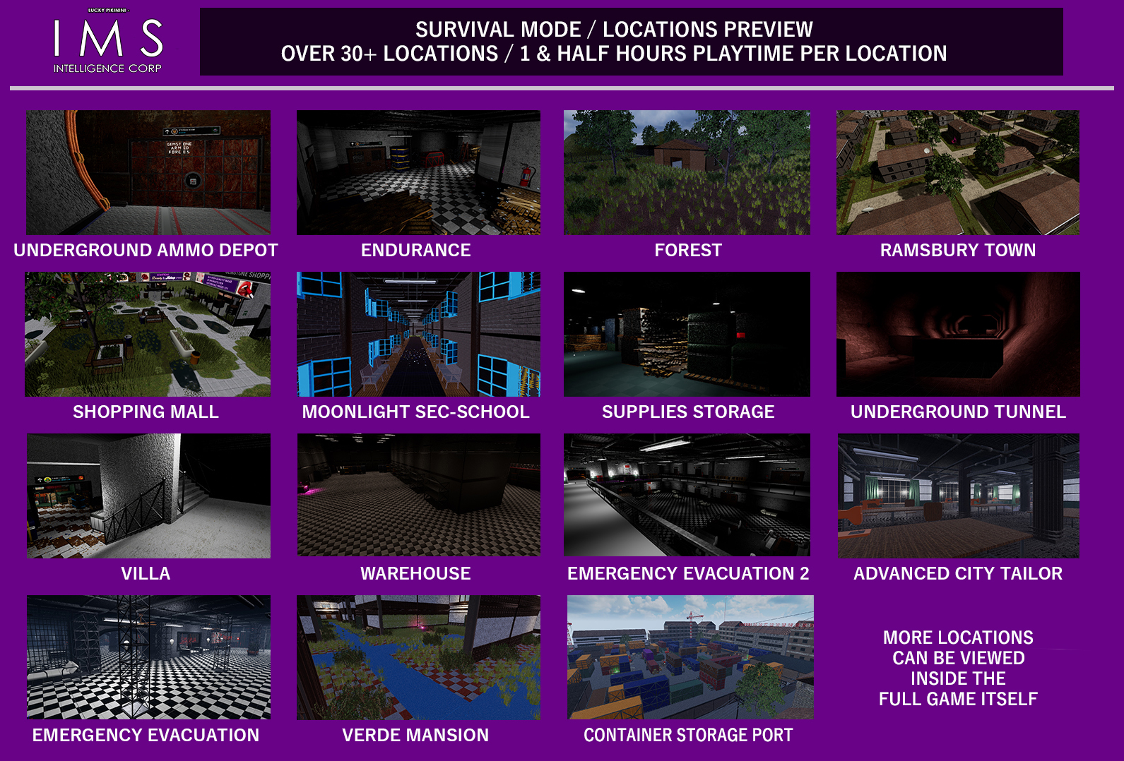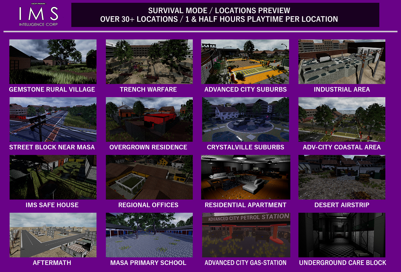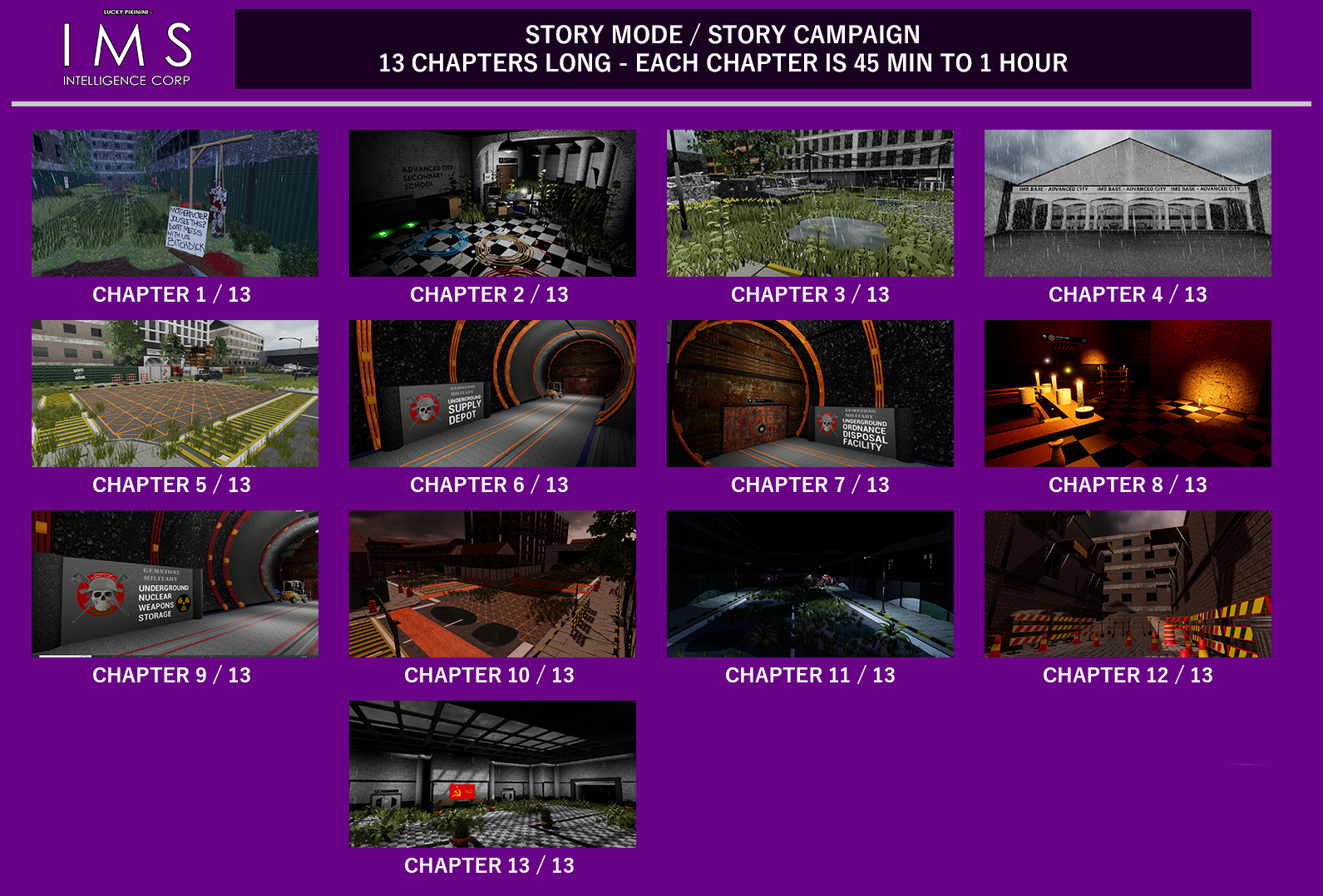 IMS Intelligence Corp (Game) was developed from the ground up as the biggest, longest and most ambitious Super Incursion Installment to date, its story campaign is longer than all previous installments campaigns. Its got the largest amount of Launch content than any other installment. Its Story is 13 Chapters long each chapter being 45 mins to 1 hour to complete. Its got over 25 survival maps each being 2 hours to complete. IMS Intelligence Corp is the largest game in terms of how much playable Base Content it has and it has alot of Post-Launch Bonus Content scheduled to be developed and added to the game through updates. These will bring in brand new Survival Mode and Special Missions guns, maps and graphical upgrades further expanding the game. This Bonus Content will bolster the already available launch content making the game even larger.